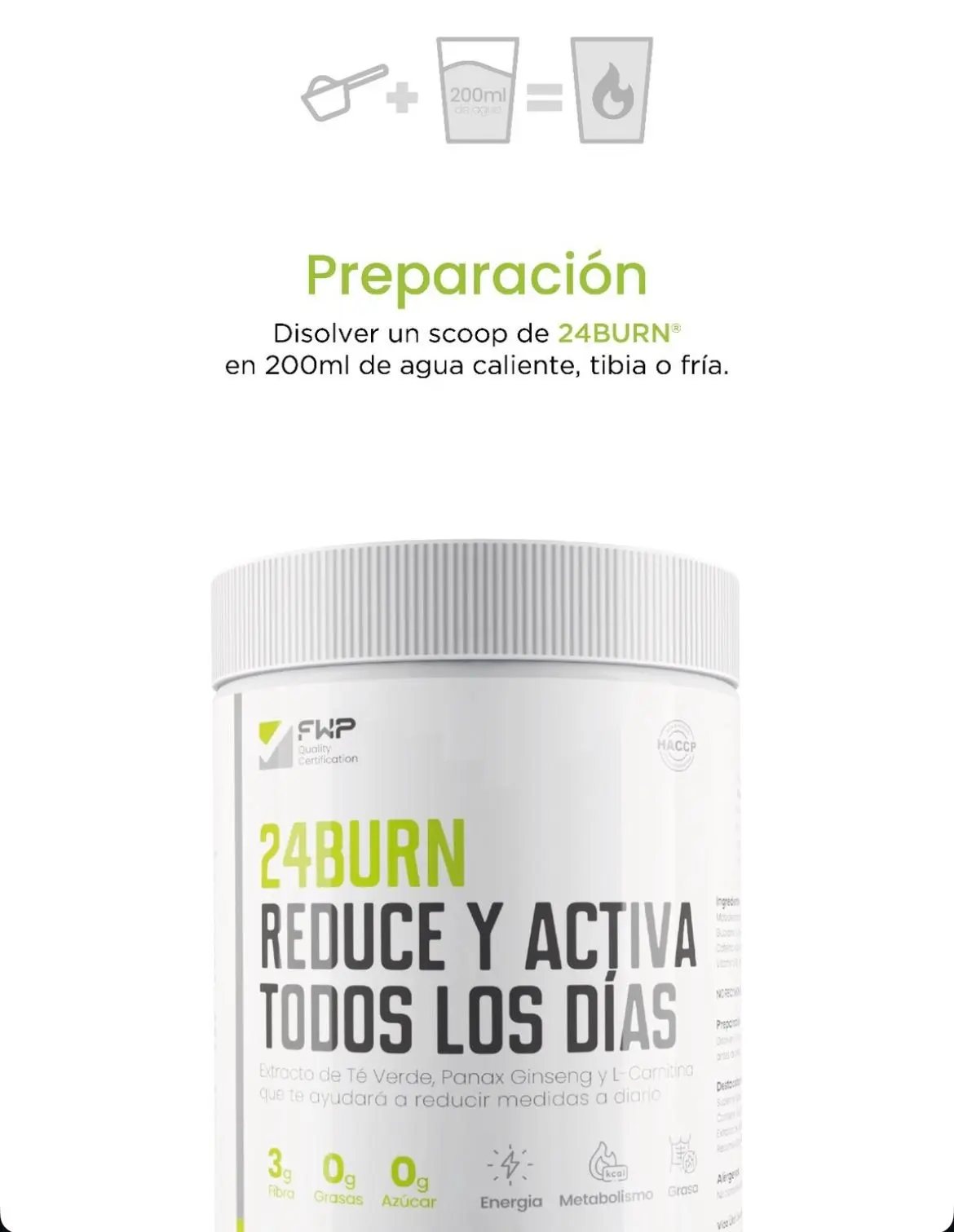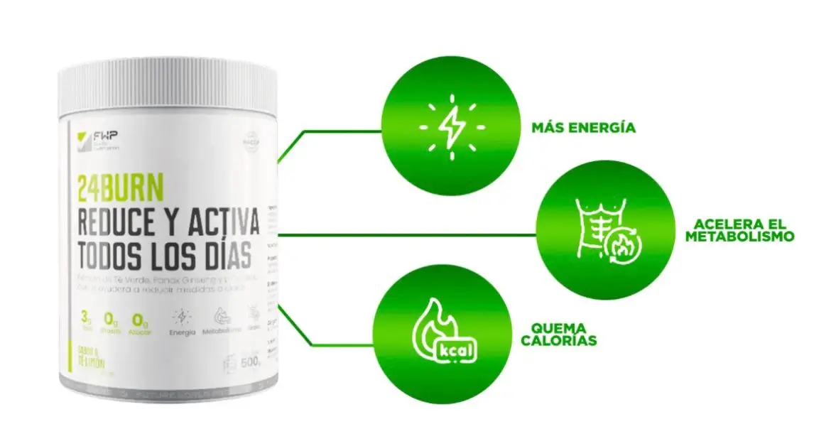 ¿Tiene efectos secundarios? ¿Es seguro? ✅ Sí, es 100% seguro. 24BURN® está formulado con extractos naturales como té verde, ginseng, L-carnitina y vitaminas. No contiene azúcar ni ingredientes agresivos, por lo tanto, es apto para personas con hipertensión o diabetes tipo 2.