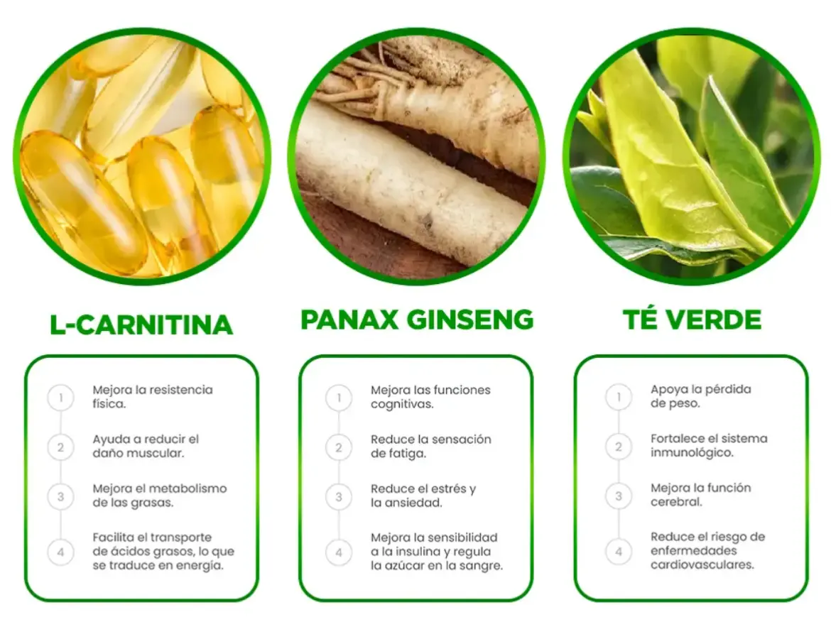L-Carnitina: Transforma grasa acumulada en energía útil.