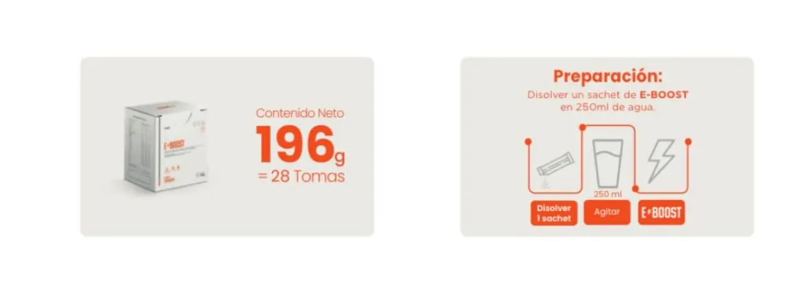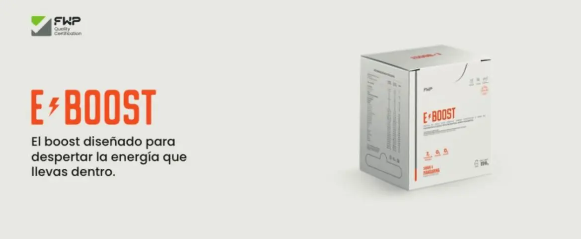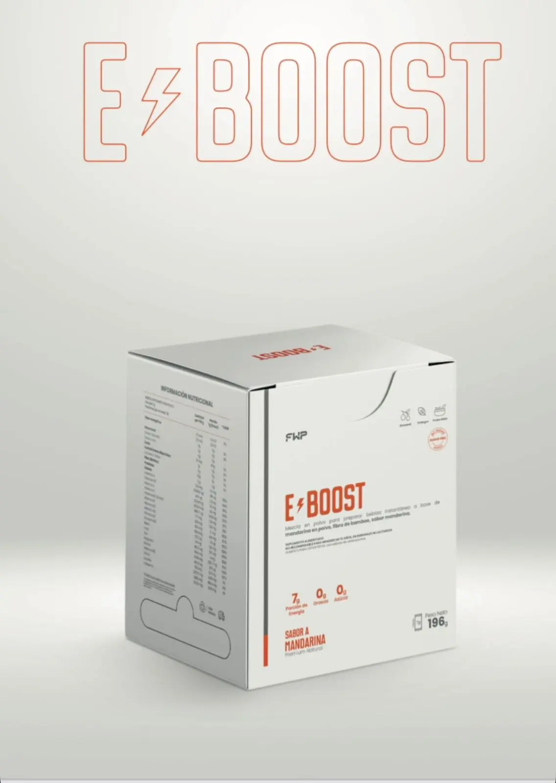 E-BOOST es un suplemento en forma de polvo (presentación en sachets de ~7 g cada uno) de la marca FWP, diseñado para aportar “energía natural” y enfoque mental.