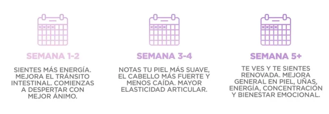 ¿En cuánto tiempo veré resultados? Los primeros beneficios se notan entre la semana 1 y 2 (energía y digestión), y los resultados visibles como mejora en piel, cabello y uñas aparecen desde la semana 3 en adelante.